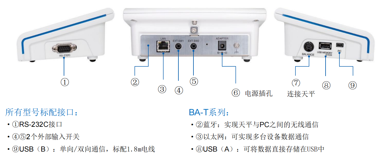 ● 内置校准砝码,单键自动自校准(BA系列)